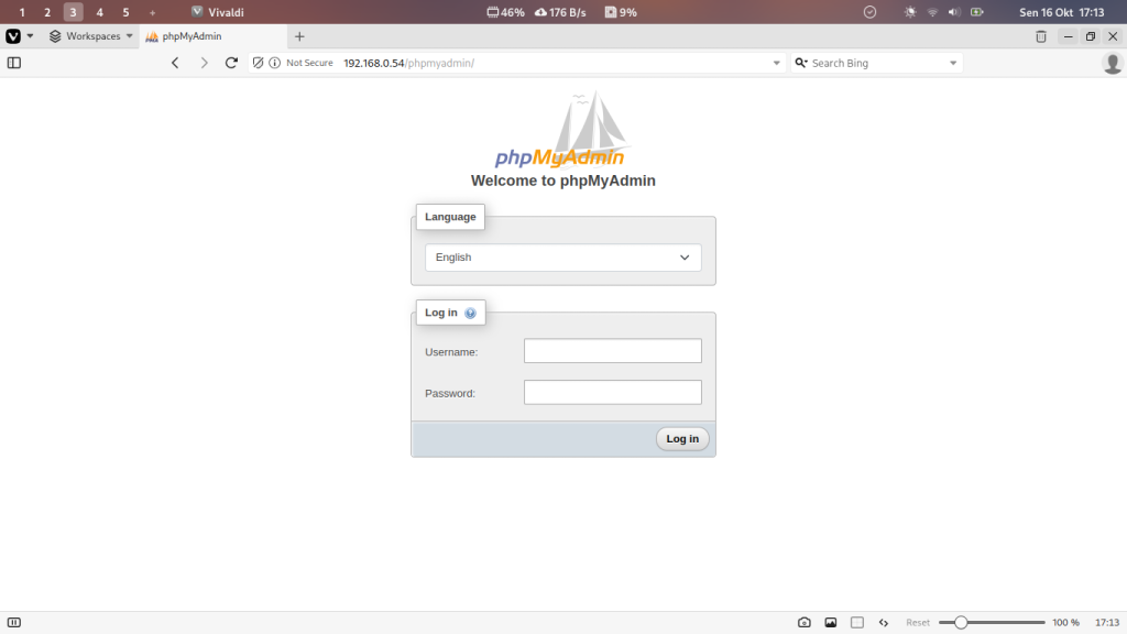 Selanjutnya untuk melakukan pengulian, kita dapat mengakses alamat server yang kita miliki ditambah dengan direktory phpmyadmin seperti dibawah ini.