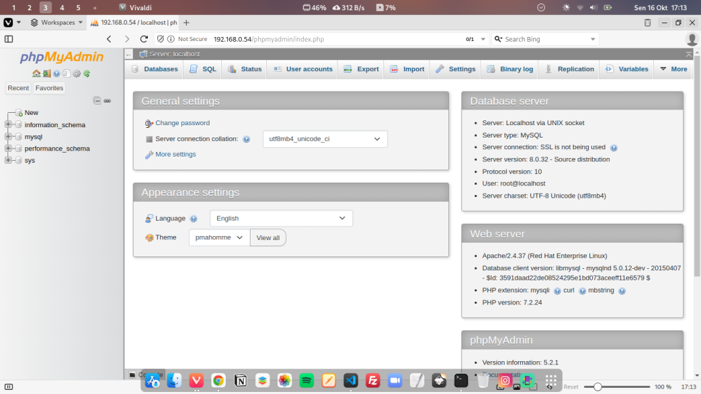 Setelah itu coba login dengan menggunakan username dan password dari database MySQL/MariaDB yang kalian miliki. Hasilnya kita akan diarahkan ke dashboard utama phpmyadmin.